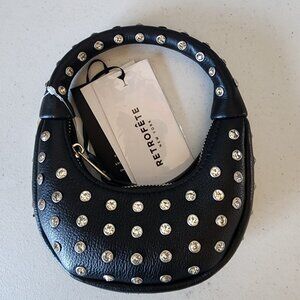 "NEW" Gorgeous Black Pebbled Leather Crystal Embellished Mini Bag By Retrofete New York. Zip Top Closure, Satin Interior/ Lining, Top Handle with 4.5" Drop, Bag Measures approx. 7" W X 3.5" T X 1.5" D, 7.5" Tall Top to Bottom, New, Tags:) Rt.398.00 approx. * This Bag is So Pretty in Person & Actually Can Hold Lip Gloss, Keys, I.D./Credit Card. ***Perfect Date Night/Event Bag, Dressy to Casual.