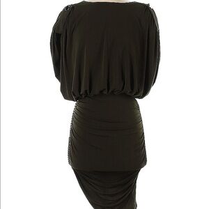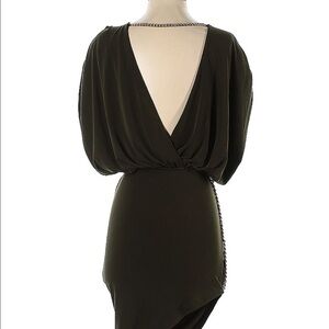 Beautiful olive green mini dress from retrofete. Has gold chain detailing on side skirt and back (does not have t chain like in the stock photo) shoulder pads. Lots of stretch with a high neckline but dips low in the back. Has a small hole on skirt (see photo) but it’s not noticeable when wearing