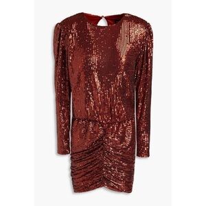 The Retrofête Flynn mini dress is crafted from sequined tulle with shoulder pads, gathered sleeves, and a ruched skirt. It has an open back and a button fastening. The dress is fully lined and made of a stretchy, mid-weight fabric. Dry clean only.