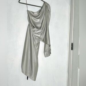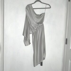Retrofete Silver Silk Asymmetrical Ruched Neva Dress. Size XS