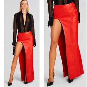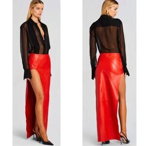 Retrofete Tash Leather Asymmetric High Slit Fiery Red Maxi Skirt Size Medium is brand new with tags! Sold out everywhere and such a statement piece!