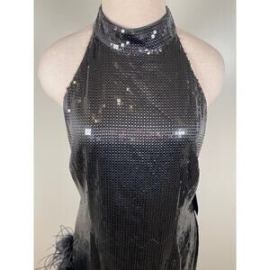 Retrofete Vixen Sequin Feather Hem High Slit Halterneck Maxi Dress Size Large