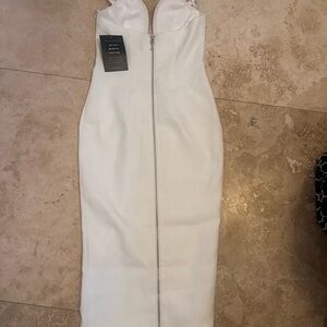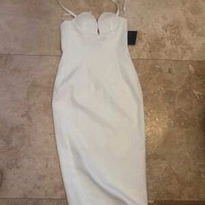 This stunning white midi dress by Retrofete features a chic halter neckline and a bodycon fit that elegantly contours the figure. Perfect for bridal or cocktail occasions, its sleeveless design and sleek silhouette offer a modern and sophisticated look.
