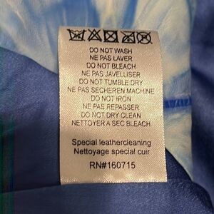 Gorgeous leather tie dye mini skirt in hues of blue. Pair with a chunky cashmere sweater and white boots and you will be channeling the 70s! About as retro as you can get!