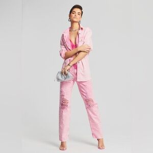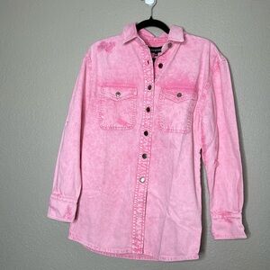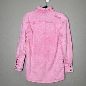 Who says you can't look polished even on low-key days? An edgy take on a denim classic, our Doreen Shirt simplifies everyday dressing. The distressed button-down top can be worn closed or open and layered with a graphic tee. Shown here in Vintage Pink.