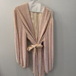 NEW WITH TAGS and extra sequins. Enveloped in hand-stitched sequin embellishments, this timeless silhouette features a wrap bodice, which is complemented by voluminous blouson sleeves and a velvet tie belt to cinch the waist. Color is Taffy Pink. Size Small. originally $675