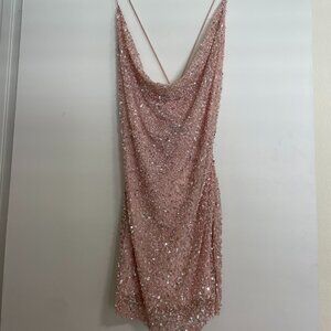 Retrofête Mich Sequin Dress in Pastel Pink. The sequin-embroidered spaghetti strap mini dress, drapes effortlessly over your body and features a cowl neckline.