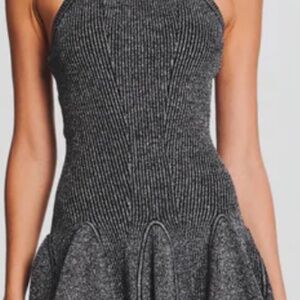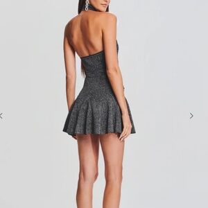 Designed with a bodycon silhouette and a godet skirt. Dress offers minimal coverage at the bust. Metallic ribbed knit offers give.