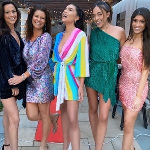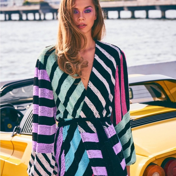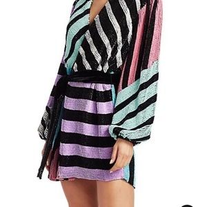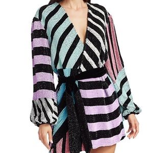 Fashionable robe-inspired dress with hand-embroidered sequins, satin lining and velvet belt. Surplice V-neck Blouson sleeves with elasticized cuffs Self-tie at waist High-low hem Rainbow stripes