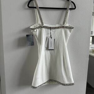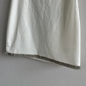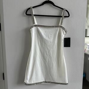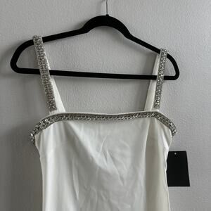 Our Regina Dress blends just the right amount of sparkle with a streamlined silhouette. This minimalistic staple is crafted with a square-neckline with crystal trim, which also runs along the hemline. Prepare to turn heads. Shown here in White/Silver.
