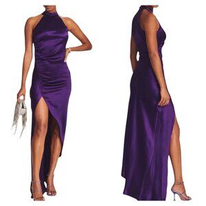Keywords: Retrofete SAB dress, purple satin formal dress, high neck ruched gown, asymmetrical slit evening dress, Retrofête high slit dress, wedding guest gown, luxury satin halter dress