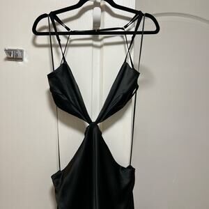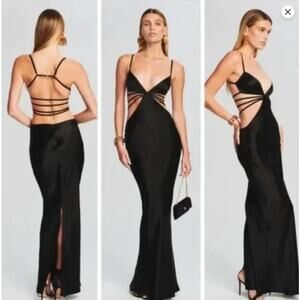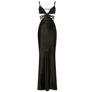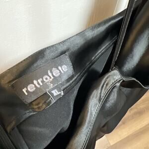 Elegant Retrofête Selma Gown in black satin, crafted from 76% acetate and 24% polyester. Designed in a sleek column silhouette, this sleeveless dress features a flattering V-neckline and a hidden back zipper closure. Size XL. Please see size and fit notes for length measurements. Condition is excellent with no visible signs of wear. A timeless evening look perfect for special occasions.