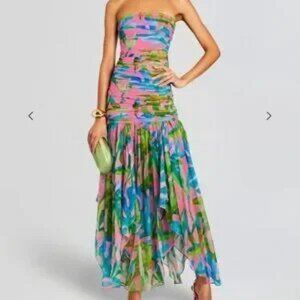 Featuring a strapless design and a flattering ruched bodice, this summer dress is perfect for a beach vacation or a destination event.