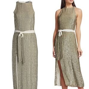 New With Tag Retrofête Tilly Sequin Tie-Sash Midi Dress with flaws: minor sequins missing on front shoulder on left side and back right side on neckline, back left side above underarm, and one side of belt. Lastly, button missing on back neckline and minor dirt marks on lining on front neckline. (See last 6 photos for flaws and all photos/video for the condition of the dress).