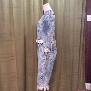 Chic one-shoulder denim romper by Retrofête. Features a stylish frayed hem. Comes with belt , new, no tags