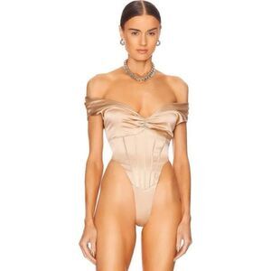Our Rozik Bodysuit flawlessly modernizes romantic details from the past to create a top suited for today. The corset bodice features off-the-shoulder straps and a gathered bust with boning that then cascades into exaggerated high cutouts at the hip. This will highlight your curves in the most unexpected way. Shown here in Nude.
