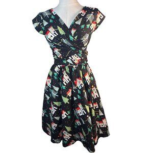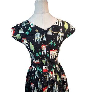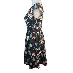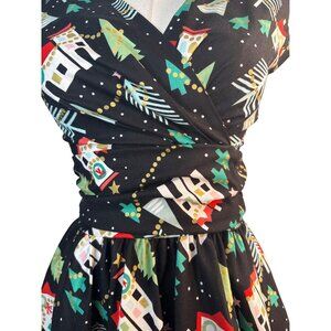 This charming retro dress features a festive Christmas village print, a flattering wrap-style bodice, and a full skirt, ideal for seasonal gatherings. Black fit-and-flare dress, ebony jet-black background, multicolor holiday print, christmas pattern, festive houses and trees motif, cotton knit fabric, soft stretchy material, vintage-inspired silhouette, holiday, gifting, retro A-line shape, flattering wrapped bodice, cap-sleeve style, swing skirt design, charming novelty print, whimsical winter theme, party dress, holiday gathering outfit, seasonal celebration wear, cozy winter fashion, cute festive style, chic retro look, stylish playful vibe, elegant nostalgic feel