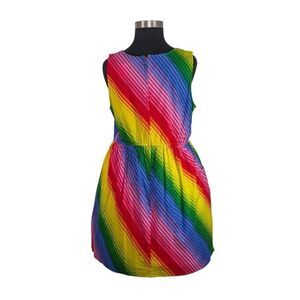 Forget chasing the rainbow, everyone will be chasing you when you're wearing this amazingly colorful dress! The tank style fit and flare dress has a bright rainbow striped allover print perfect for pride. The fitted bodice has princess seams to accent the fitted, gathered waistband and leads to a circle skirt with pockets. Back zipper closure.