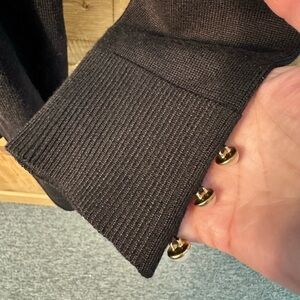 Gorgeous rayon polyester blend sweater. Open front pearl button accents at end of sleeves. This classic cardigan will go with everything perfect for the office or paired with a T-shirt and pair of jeans..