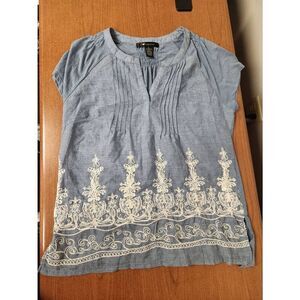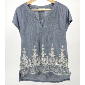 Retrology Grey/Blue V Cut Sheer soft Blouse with front embroidery Size LARGE