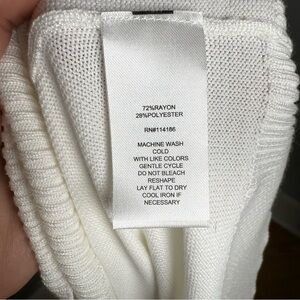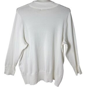 Chic and timeless, this cozy turtleneck sweater is the perfect layering piece for cooler days. Designed in a crisp white knit with ribbed hem, collar, and cuffs. The sleeve cuffs feature elegant button details that add a touch of sophistication. Easy to dress up or down — pair with jeans for casual chic or layer under a blazer for polished style.