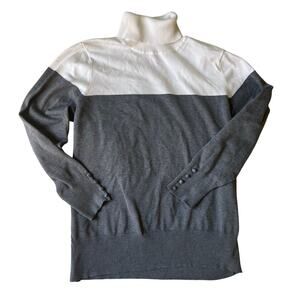 Lovely color block pullover turtle neck sweater by Retrology in size 1X. Features white and gray knit with ribbed detailing at turtleneck, cuffs, and hem. Covered button detailing on the cuffs. Perfect for fall and winter. Cozy but comfortable light-medium weight knit. Ideal for preppy, weekender, minimalistic styling. Great for weekend styling or the office. Excellent pre-owned condition.