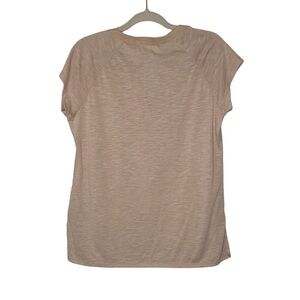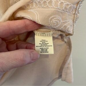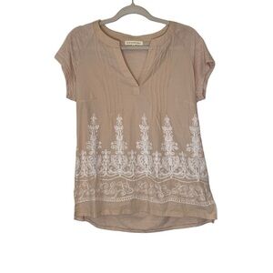 Retrology tan boho cap sleeve cotton front blouse with beautiful white embroidery, vneck opening, vents on side. Back material is a poly rayon blend. Super soft and lightweight! Pair it with a white jean! Classic, boho, breathable, comfortable, beach, coastal, coastal grandma. Size M