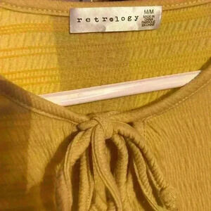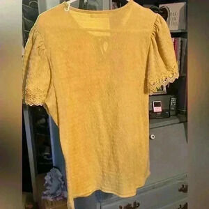 Retrology yellow keyhole shirt with crochet sleeve trim