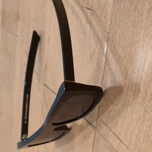 Black lens, black frame. Shows some dings and scratches from regular wear that happen on sunglasses but don't show up in photos - you're not buying something new but you're not buying something wrecked, either. Measures 53 mm frame size and 140mm temple arm length. Comes with an akila case, the original denizens of which were purloined by my toddler and are yet to be recovered, perhaps lost to time.