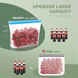 Leakproof , Airtight: The double-seal zipper design keeps liquids and air locked inside; At the same time,the airtight function of reusable food bags will keep your food fresh lo