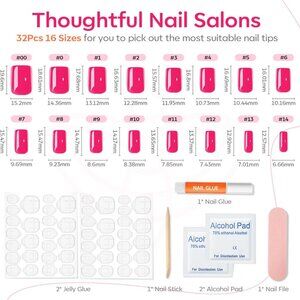 32 pcs Nails in 16 Sizes: The press on nails kit comes with 32pcs press on nails in 16 different sizes. Includes nail glue, 2 sheets jelly adhesive tabs, double-sided nail file, cuticle stick, and cleanser/dehydrater pad.