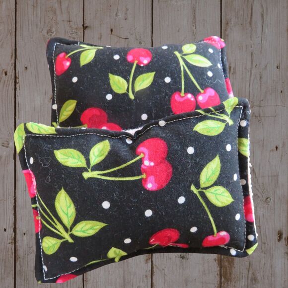 A sponge with black fabric with red cherries and pink terry cloth on the back.