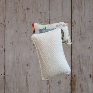 The sponges are made with a cotton print on the front. Terry cloth on the back covered with mesh. The inside is made of polyester stuffing that's hypoallergenic and mold-resistant. .