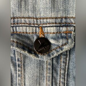 Show off your patriotic style with this Reuse denim vest featuring bold embroidered American flag detailing on the back. This medium-weight vest is perfect for layering and adds a classic Americana vibe to any outfit. Distressed touches give it a lived-in look that’s effortlessly cool.