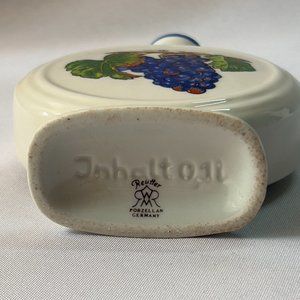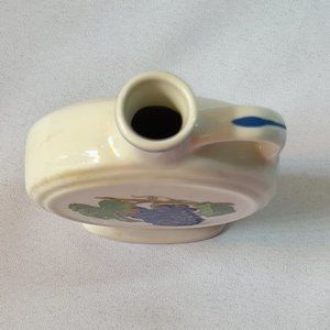 I believe this German bottle jug was designed to hold wine or liquor and most likely had a cork stopper that is long gone. Marked on the bottom “Reutter Porzellan Germany”. Pottery marked with only “Germany” are likely to have been produced between 1887 and 1949. There are the remnants of an old sticker with part of the word “Disney”. After much researching I found that Epcot World Showcase most possibly the Germany stop did in the past sell wine in jug bottles. The other mark on the bottom “Inhaltoll” means “content” in German. This lovely small jug has hand painted grapes.