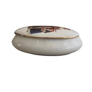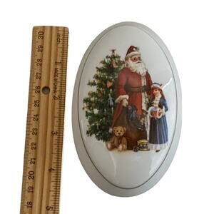 Features: porcelain; oval; trinket jewelry box with lid; graphic of Santa Claus, Victorian girl, Christmas tree and presents on cover of trinket box; collector; collectible; Christmas holiday home decor; replacement; would make a beautiful gift box; Christmas gift; holiday gift