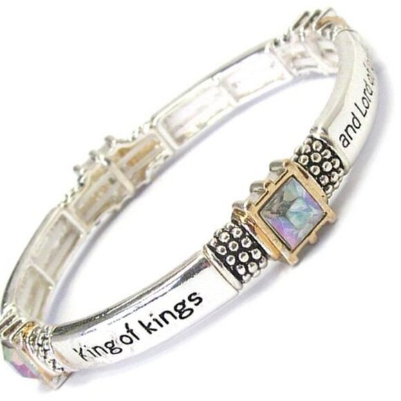 Shiny Silver Tone accented by square aurora borealis crystals with etched in Revelation 19:16 On his robe and on his thigh he has this name written; King of Kings and Lord of lords. 1/4" wide stretch style.