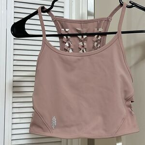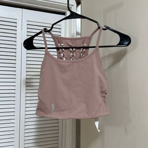 Quick-dry active crop top featuring a full coverage front with a beautiful macrame cut-out back design and a moisture wicking finish to keep you cool throughout your workout.