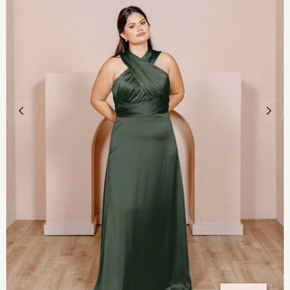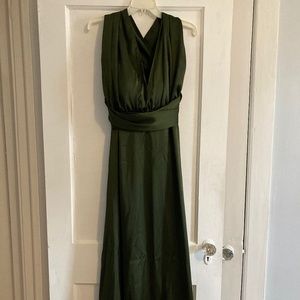 Gorgeous Revelry Devan Convertible bridesmaid dress/cocktail gown, Deep Olive-713 green satin.