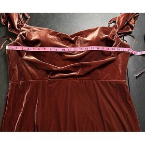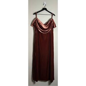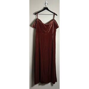 Sienna Velvet Bridesmaid's Gown in Brown Rust from Revelry. Off shoulder with adjustable straps. Built in boning. Side slit. Zipper on side. Size 24. See photos for measurements. Good preowned condition with no tears or stains.