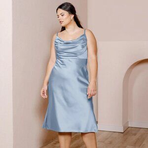 Size 8 Revelry "Skye Midi Satin" dress in French Blue; Length: Midi: 28 in waist to hem. Very mild snagging on back (see picture). Was worn once as a bridesmaid dress and dry cleaned after!