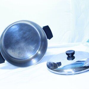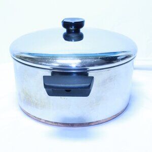 Very nice pre-owned vintage condition - clean, flat bottom - no pock marks - surface scratches on stainless as to be expected - some discoloration on copper bottom - round bakelite handle on the lid is chipped as shown - handles are tight - See photos