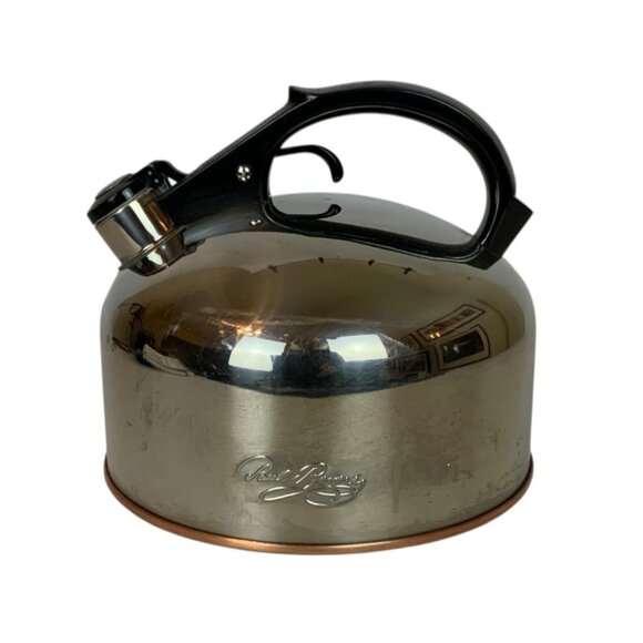 This Revere Ware tea kettle features a stainless steel build with a copper bottom for even heat distribution. It includes a whistling spout and a sturdy handle, making it a practical addition to any kitchen. The kettle's classic design complements various kitchen styles.