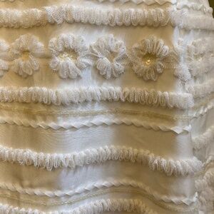 Silk Shantung strapless tea-length dress covered in horizontal net embellishment and bow at waist in ivory. Very slight sweetheart neckline, pockets, and beautiful detailing. The dress has great movement and is so fun to dance in! I can also attest that it’s possible to ride a bike in the dress, should that be of interest to any other brides. 🙂