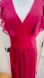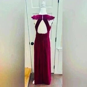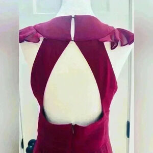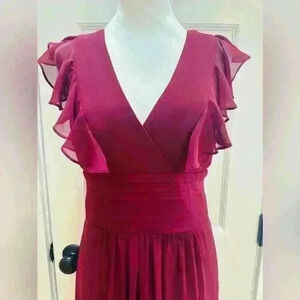 Reverie long dress, size 6 wine color, V neckline, open back, pleated waistline, fully lined, zipper back, ruffled front and shoulders. Chest measures 17” and length is 60”.