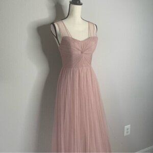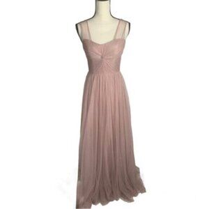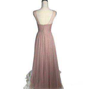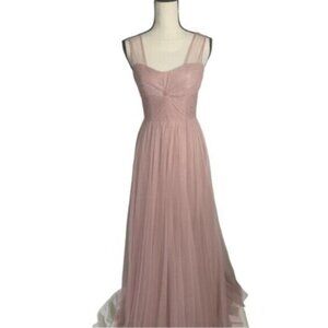 This elegant gown is a delicate and ethereal piece. The dress features a soft blush or champagne hue, enhancing its romantic and timeless appeal. The bodice is structured with a sweetheart neckline overlaid with sheer tulle, creating an illusion neckline for added sophistication. The fitted bodice accentuates the waist, while the multiple layers of fine, airy tulle in the skirt give it a flowing, graceful silhouette. From the back, the gown showcases delicate double straps that create a soft, feminine look. The fitted bodice extends into a slightly flared, floor-length skirt, with the sheer tulle overlay adding dimension and movement. The back is finished with a concealed zipper closure for a seamless fit.