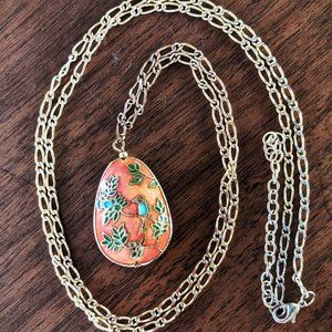 This unique pendant features a beautiful scene of gilded birds and trees against a pink background. The pendant measures approx. 1.5 x 1 inch and the chain is approx. 18 inches.