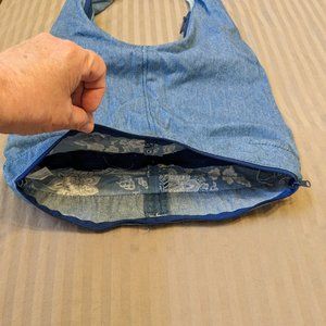 One side is light blue chambray and the other is a blue and white flower print. Both fabrics are cotton.