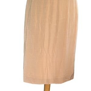 This is two skirts and one you’ve got your animal print on one side and the solid creamy tope on the reverse. In between the two layers is a lining. On the printed side of the skirt, it does have a 2 inch expose hem of the creamy taupe colored side of the skirt. It has no label. I would say it’s 100% polyester possibly. Semi-white lining between the print and the solid side. In the waist it is 14 inches and stretched and the hips are 20 inches and stretched. Keep in mind polyester does stretch this really cute little skirt they have.
