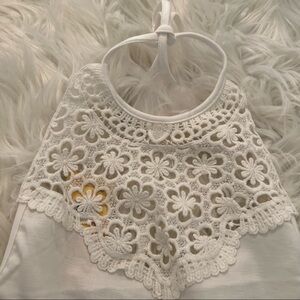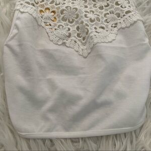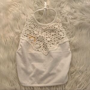 Great condition, new with tags. Reverse. Crochet tie back crop top. Solid white color. Halter neckline, open back with 2 ties in back. Style #9687. Size medium. 100% polyester. Measurements available upon request. Smoke free home. No trades, offers welcome.